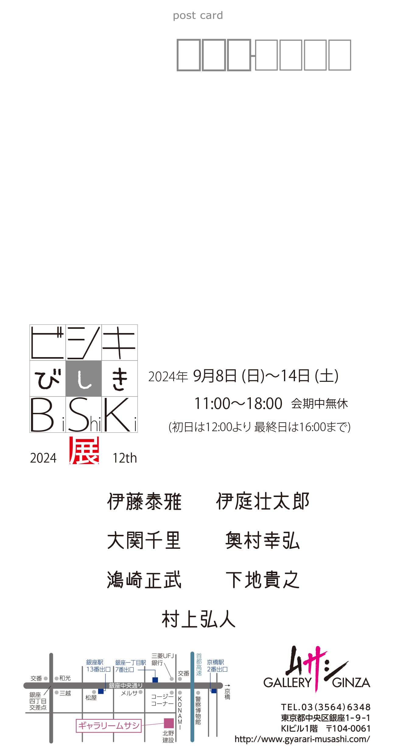 ※伊藤泰雅、伊庭壮太郎、大関千里、奥村幸弘、鴻崎正武、下地貴之、村上弘人 7人によるグループ展です。「ギャラリームサシ」にて行います。